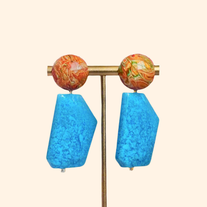 The Solstice Earrings ignite with energy and precision. Swirled amber-orange studs meet faceted sky-blue drops, creating a dynamic interplay of color and sculptural lines. Inspired by the balance of seasons and the clean geometry of origami, these earrings bring a powerful, contemporary edge to your look — where tradition folds into fearless modernity.